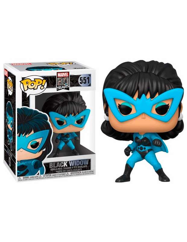Funko Pop! de Black Widow de Marvel en su edición 80 aniversario con su traje original de las primeras apariciones en los comic de color azul y negro. Este Funko Pop de Black Widow o Viuda Negra es una linea de Funko Pop de Marvel realizados a finales de 2019 con motivo del 80 aniversario de los comic de Marvel.