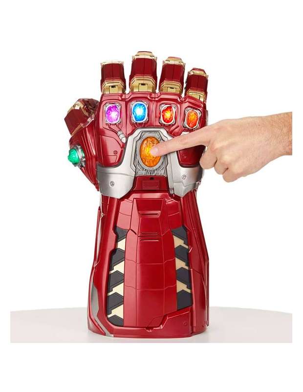 Lleva incrustadas las 6 gemas del infinito y se enciende pulsando la gema de la mente y en ese momento se iluminan todas las gemas y empieza a reproducir sonidos inspirados en la película Vengadores Endgame.