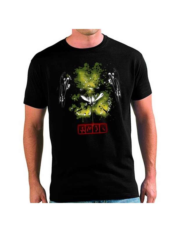 Camiseta Predator con un diseño muy original inspirada en las peliculas de Predator incluida la de 2018 en la que tambien se aprecia la cuanta atrá de autodestrucción que los Predator suelen llevar en su brazalete. Una de las camisetas más originales para fans del cine de ciencia ficción. Camiseta fabricada en manga corta o  larga y de color negra o azul marino a elegir y tallas que van desde niños 7-8 años hasta adultos 3XL.