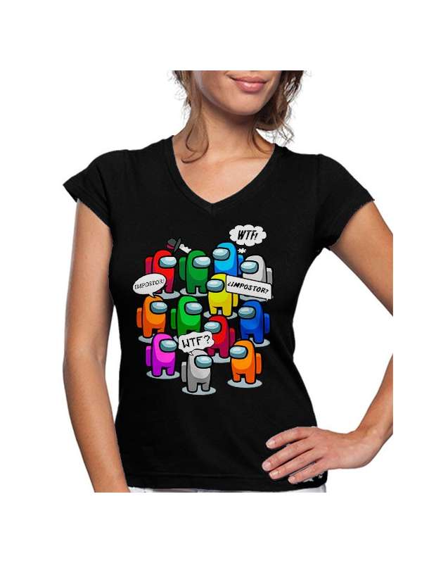 Camiseta Among Us de mujer estampada con un divertido dibujo exclusivo lleno de astronautas preguntandose quién es el impostor.. Camiseta de mujer de Among Us es de manga corta estilo japonés y cuello de pico y su diseño es exclusivo muy original y divertido por lo que sorprenderá a todos los jugadores de Among Us. Las camisetas de Among Us de mujer son de 100% algodón y puedes elegir entre varios colores