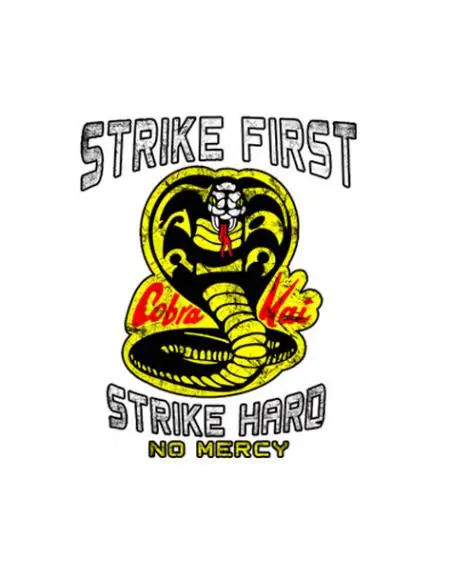 Estupenda camiseta Cobra Kai exclusiva de nuestra web estampada con la cobra de Cobra Kai y su lema Pega primero, pega fuerte y sin perdón (Strike First -Strike Hard - No Mercy) todo ello con un efecto de desgaste que junto con el estilo de la camiseta le confiere un estilo muy ochentero