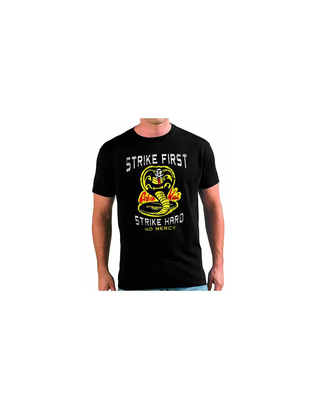 Camiseta Cobra Kai estampada con el logo de la cobra y el Lema del dojo de Cobra Kai: Pega Primero - Pega Fuerte - Sin perdón. Sin duda la serie Cobra Kai está siendo todo un éxito precedido por las películas de Karate Kid que le hacen de buque insignea. La camiseta de Cobra Kai con el lema del dojo es de algodón 100% y el estilo de camiseta es de corte recto Hombre - Unisex