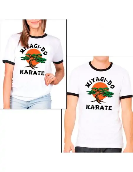 Camiseta Miyagi Do Karate inspirada en la serie de televisión Cobra Kai estampada con el logo clásico de Miyagi Do Karate tal y como se ve en las imágenes. Camiseta estilo unisex con las mangas con ribete negro o rojo a elegir sobre camiseta blanca del estilo de los años 80. Esta camiseta es de corte pequeño para hombre ya que es unisex válido para hombre y mujer te recomendamos que mires bien tu talla en enlace de más abajo.