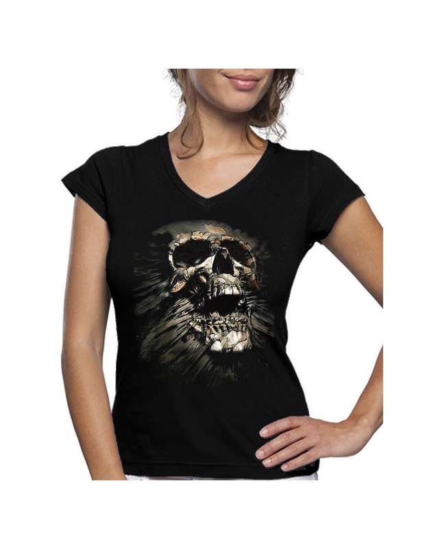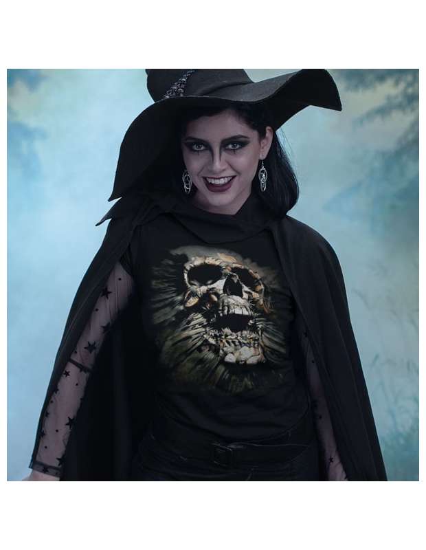 Espectacular camiseta de calavera para mujer estampada con un dibujo estilo 3D en la que parece que un cráneo de calavera quiere espacapar de tu camiseta. Un diseño muy cuidado y exclusivo con en prespectiva que imita un efecto 3D gracias a sus contrastes y sombras (La camiseta no tiene relieve). Y, desde luego!!! la puedes usar en Halloween y durante todo el año y sorprender a todo el mundo gracias a su espectacular estampado
