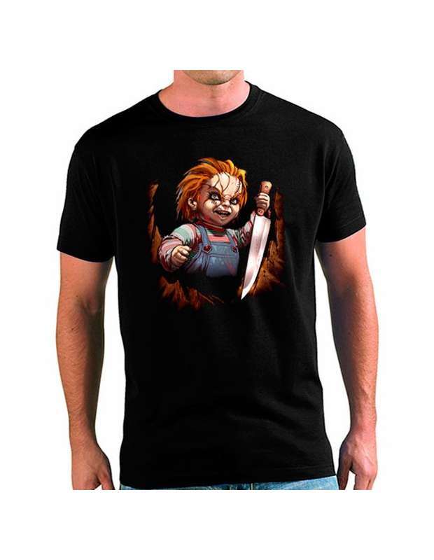 Camiseta unisex - hombre con un diseño muy original y personalizada con una ilustración de el muñeco diabólico Chucky lleno de cicatrices y con un cuchillo en sus manos. Camiseta especialmente pensada para fans del cine de terror de los 80 y los 90, que no dejará a nadie indiferente. Ahh y por supuesto ideal para ponertela en Halloween ;).