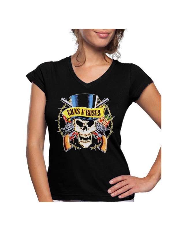 Camiseta Guns and Roses de mujer Hat Skull and Pistols con diseño (Revólveres, rosas, alambre de espino y un sombrero de copa) que es uno de los emblemas más reconocibles de este mítico grupo de Rock. La camiseta Guns n´ Roses de mujer la tienes disponible en 2 estilos diferentes; Manga corta con cuello de pico y manga larga con cuello redondo