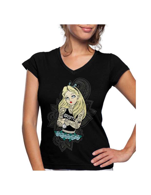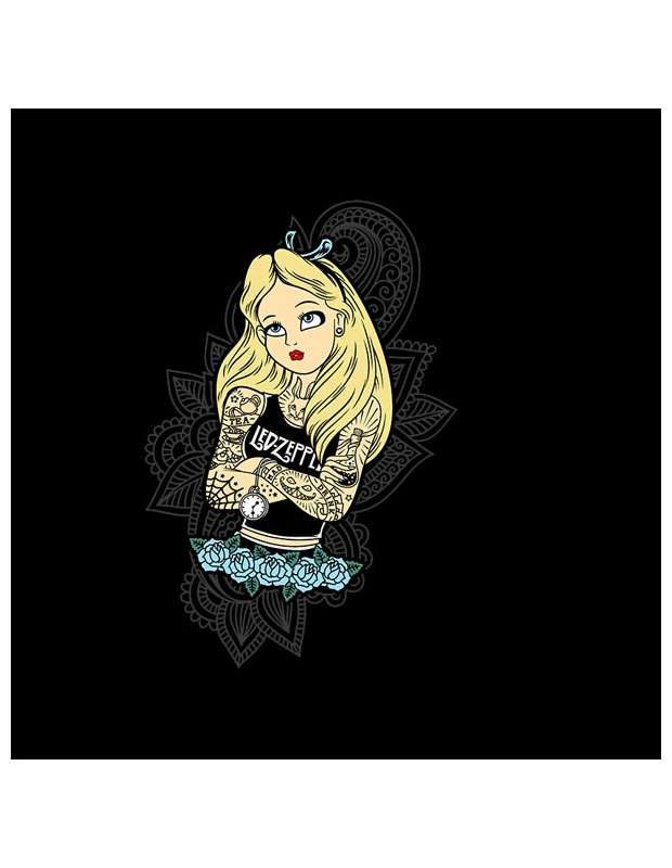 Estupenda Camiseta de Alicia en el país de las maravillas rockera ideal para regalar en el día de la madre para mamás rockeras. Esta fantástica camiseta lleva estampado un dibujo artístico de una versión de Alicia rockera con tattoos incluidos que fijo que le molará a cualquier mamá que comparta su afición del rock con las pelis de Disney.
