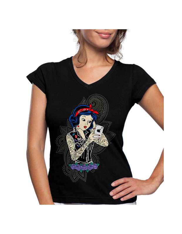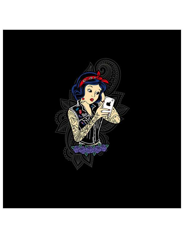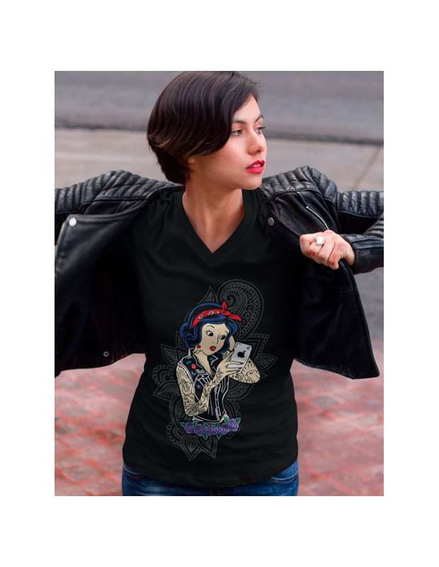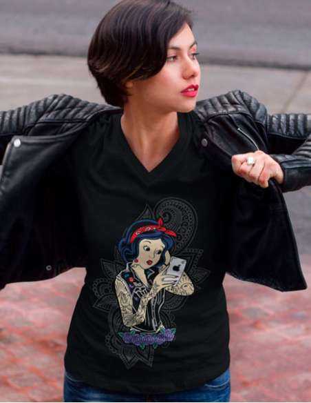 Estupenda Camiseta de Blanca NIeves rockera ideal para regalar en el día de la madre para mamás rockeras. Esta fantástica camiseta lleva estampado un dibujo artístico de una versión de Blanca NIeves rockera con tattoos incluidos que fijo que le molará a cualquier mamá que comparta su afición del rock con las pelis de Disney.