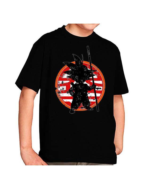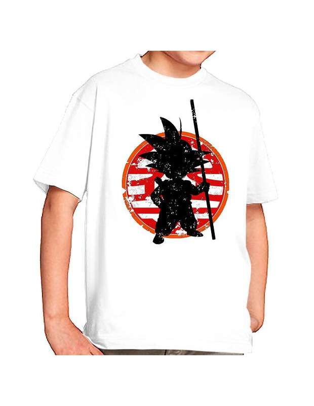 Camiseta Dragon Ball para niños del personaje Son Goku con su inseparable bastón que le acompaña durante toda su infancia y en todas sus aventuras.