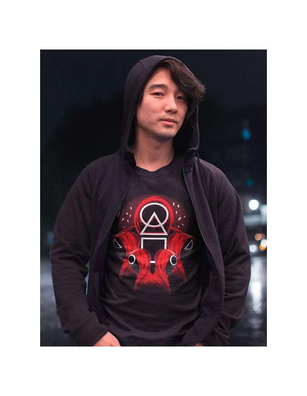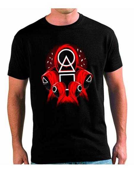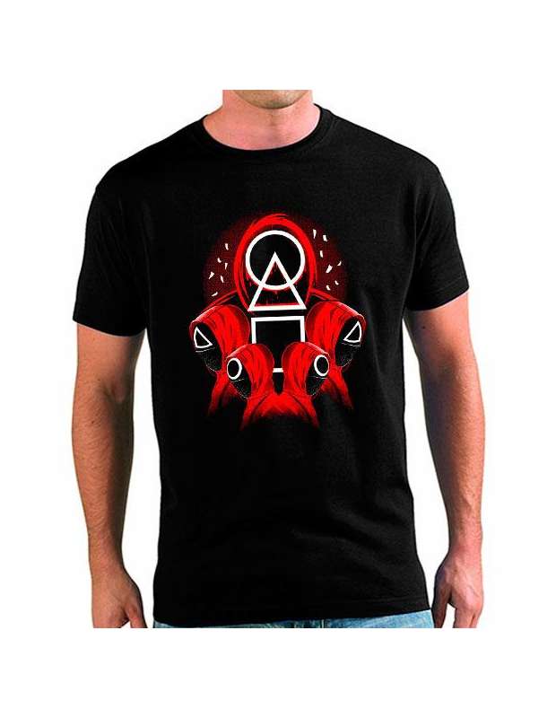 Fatástica camiseta inspirada en la serie de televisión El Juego Del Calamar estampada con un dibujio estilo fan art de varios guardias con motivos de la serie estilo Fan Art, por ello en un diseño muy reconocible para los que ya han visto la serie. La camiseta se ha estampado sobre camiseta de algodón de 150gms (Grosor medio de camiseta). Para estampar esta camiseta se han usado tintas respetuosas con el medio ambiente y con tu piel de gran resistencia a los lavados.