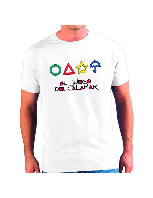 Fatástica camiseta inspirada en la serie de televisión El Juego Del Calamar estampada con la temática de uno de los juegos de la serie, El Juego de las Figuras de Caramelo, que pese a su temática infantil cuesta la vida a muchos de los personajes. La camiseta tiene un diseño muy reconocible para los que ya han visto la serie y el dibujo se ha estampado sobre camiseta de algodón de 150gms (Grosor medio de camiseta). Para estampar esta camiseta se han usado tintas respetuosas con el medio ambiente y con tu piel de gran resistencia a los lavados.