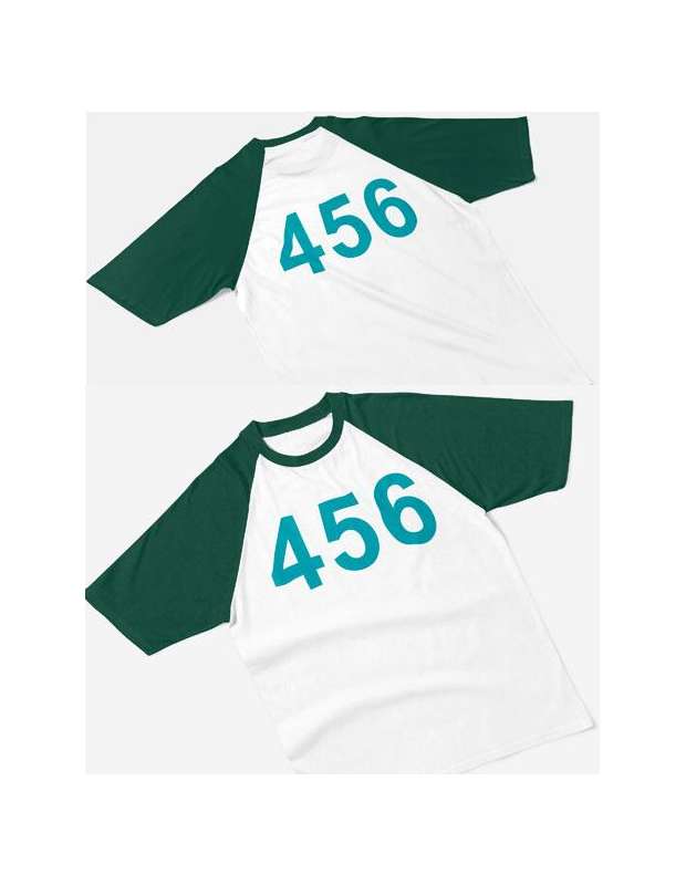 Fatástica camiseta fanart inspirada en la serie de televisión El Juego Del Calamar. La camiseta tiene casi la misma combinacion y forma que en la serie y los colores son en apariencia tal como los lleva el jugador nº456. Esta fantástica camiseta unisex la puedes llevar tanto para vestir como para un cosplay . La camiseta esta confeccionada en color blanco con detalles en cuello y mangas estilo reglan de color verde botella y el nº 456 se ha estampado posteriormente con tintas respetuosas con el planeta y con tu piel de gran resistencia a los lavados..