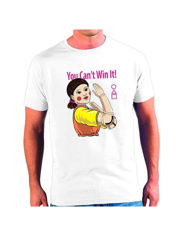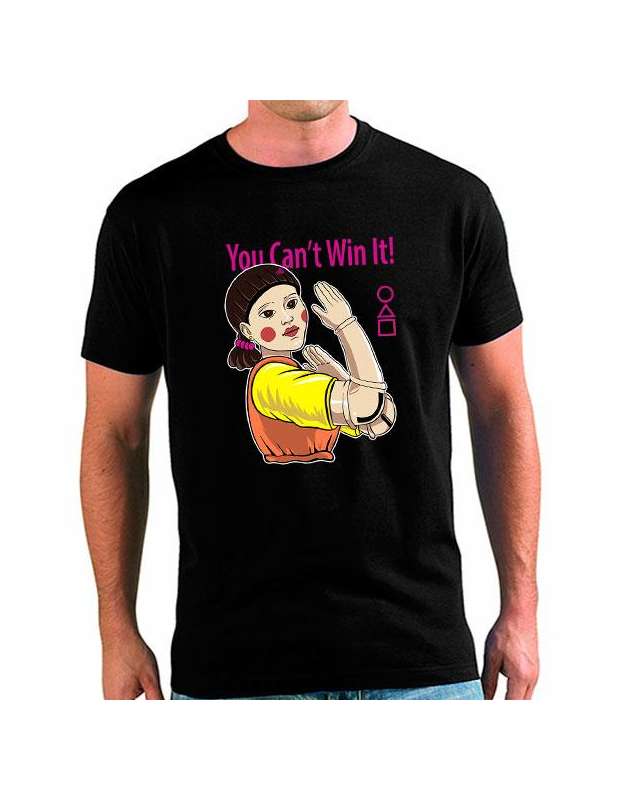 Fatástica camiseta inspirada en El Juego Del Calamar estampada con una versión feminista de la aterradora muñeca del juego Luz Verde Luz Roja. Espectacular diseño estilo feminista estampado sobre camiseta de algodón de 150gms (Grosor medio de camiseta) y a elegir en 3 colores diferentes. Si has visto la serie seguro que esta muñeca se te quedó grabada en las retinas por su aterradora dulzura...Por lo que si alguien ve el dibujo de la camiseta identificará la serie de El Juego del calamar al momento. Para estampar la muñeca de Luz Verde Luz  Roja se han usado tintas respetuosas con el medio ambiente y con tu piel de gran resistencia a los lavados.