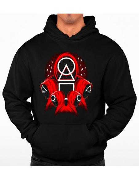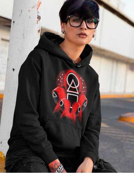 Sudadera con capucha inspirada en El Juego Del Calamar o Squid Game, la fabulosa serie de televisión koreana que está de moda. En esta ocasión te presentamos una sudadera estampada con un diseño fan art con vaios guardias y motivos de la serie estilo graffiti. La sudadera tiene capucha y bolsillos y lleva felpa interior para ir calentito-a e invierno, es de un grosor de 280gms (Grosor medio alto de sudadera) y para estamparla se han usado tintas respetuosas con el medio ambiente y con tu piel de gran resistencia a los lavados.