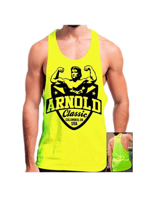 Camiseta Arnold Classic tirantes amarillo fluor gimnasio.