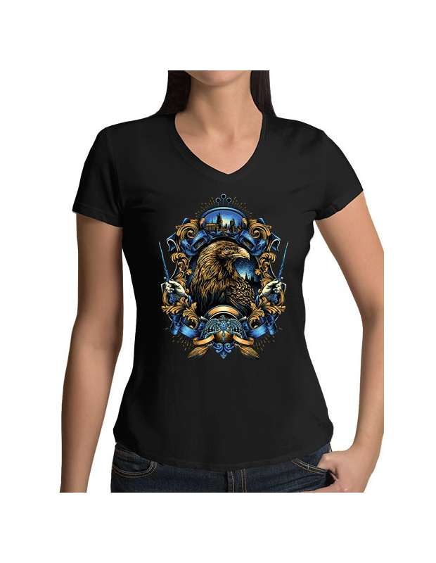 Espectacular camiseta Harry Potter de mujer personalizada con diseño fanart del emblema de la casa Ravenclaw. Camiseta de mujer para chicas fans de la casa Ravenclaw estampada con espectacular dibujo que contiene varios elementos que hacen referencia al mundo mágico de Harry Potter mezclado con algunos elementos básicos de Ravenclaw. Tienes la opción de elegirla en manga corta estilo japonés y cuello de pico o en tirantes de estilo natación.