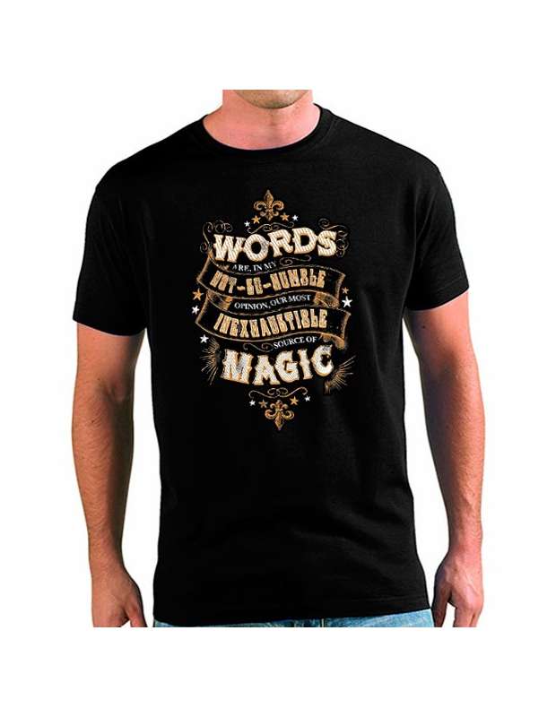 Camiseta personalizada Harry Potter con diseño muy artístico de unas sabias palabras de Dumbledore en inglés que dicen "Las palabras son, en mi opinión no tan humilde, nuestra fuente de magia más inagotable". Camiseta Unisex muy original inspirada en los mundos mágicos de Harry Potter disponible en todas las tallas desde niños de 9 a 12 años y adultos desde Talla XS hasta 3XL. Camiseta muy original que está fabricada en en algodón 100% por prestigiosos magos en el Callejón Diagón por lo que resisten muchas lavadas sin perder calidad.smiley-wink.gif