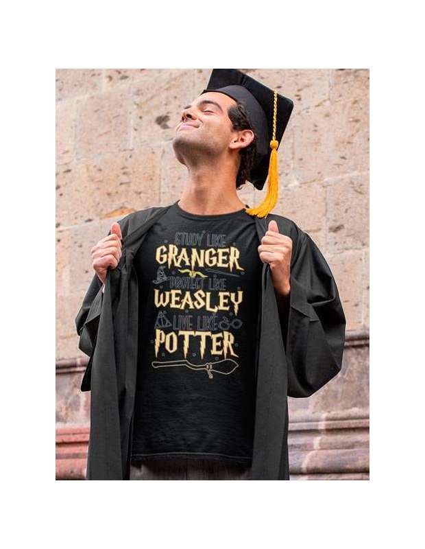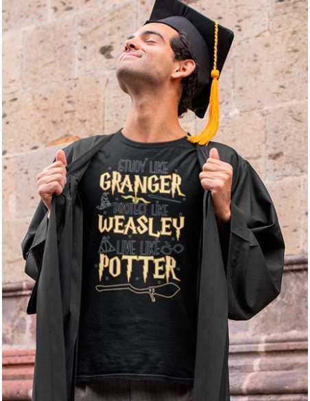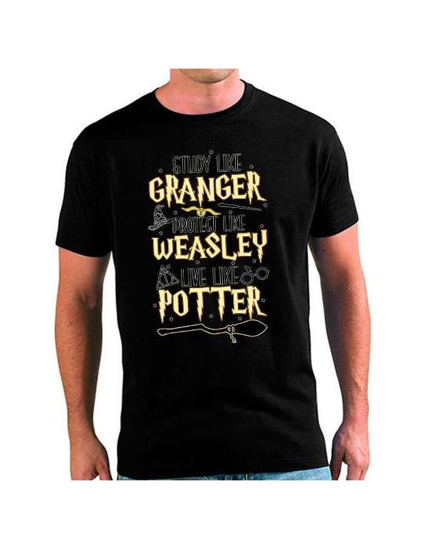Camiseta inspirada en las películas uy libros de Harry Potter estampada con un diseño muy original en el que se puede leer la frase en inglés que dice al go muy parecido  esto: Estudia con Granger,Protege como un Weasley y Vive como Potter. La camiseta es de tipo Unisex con dibujo fanart diseñada por nuestro equipo por lo que igual a esta solo la vas a ver en nuestra web . La tienes disponible en todas las tallas, desde niños de 7 a 12 años y adultos desde Talla XS hasta 3XL. Está estampada en algodón 100% en nuestro taller por prestigiosos magos en el Callejón Diagón por lo que resisten muchas lavadas sin perder calidad.