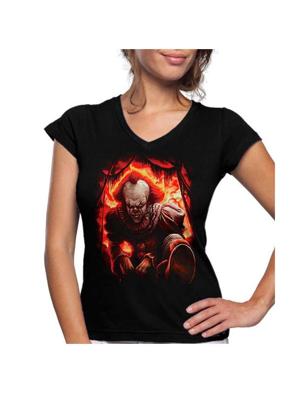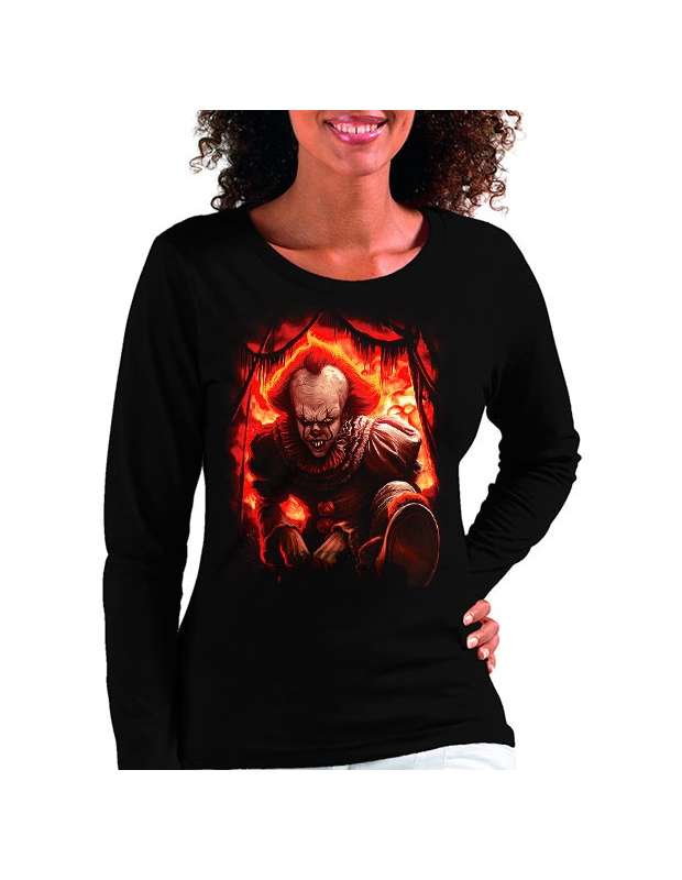 Terrorífica camiseta de mujer de IT el payaso Pennywise o ESO a alegir en manga corta o larga en el selector del modelo y en todas las tallas, estampada en España con tintas respetuosas con el medio ambiente y con tu piel de gran resistencia a los lavados. Composición 100% algodón.