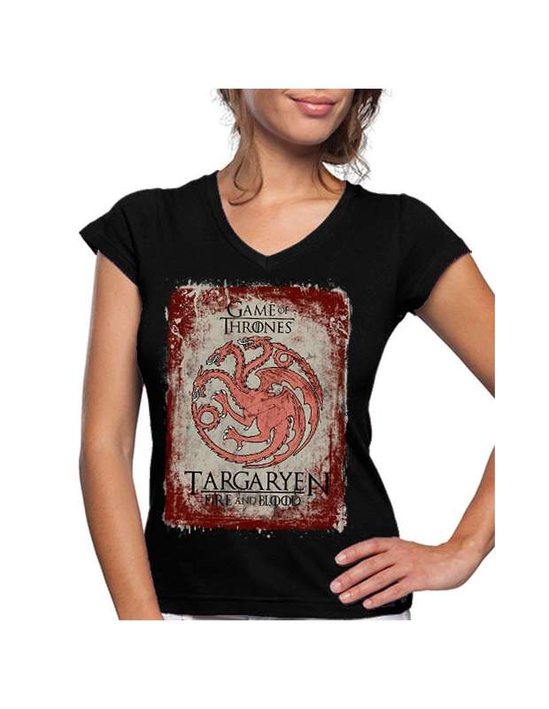 Camiseta de mujer con cuello de pico y diseño Casa Targaryen Fire and Blood inspirada en la fabulosa serie de television "Juego de tronos" de estilo desgastado. Una camiseta personalizada y con un diseño muy original de la casa Targaryen disponible en manga corta de mujer de ti`po japonés. Camiseta realizada en algodón 100% de 150gms y estampada en España con tintas respetuosas con el medio ambiente de gran resistencia a los lavados