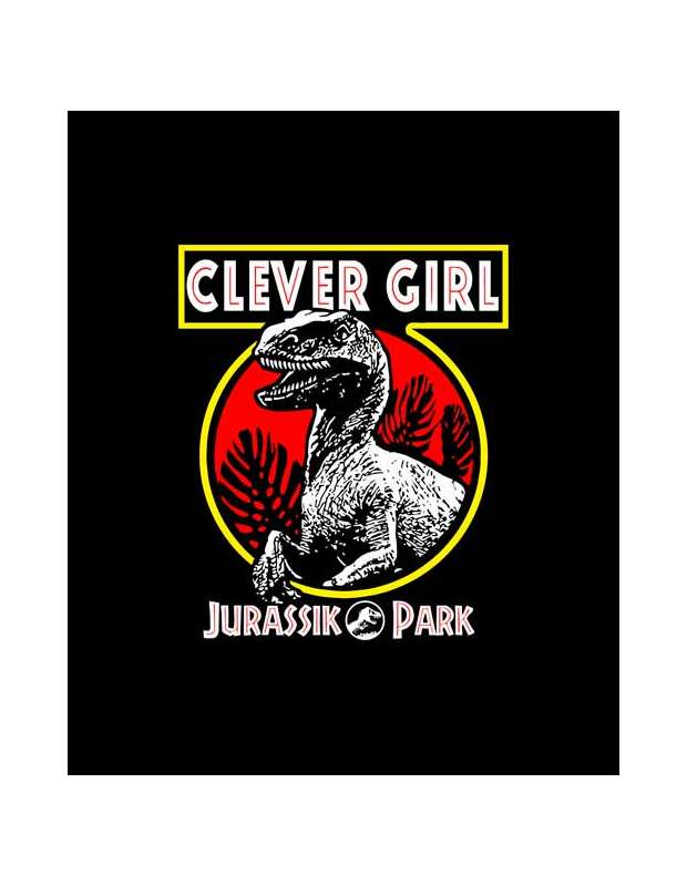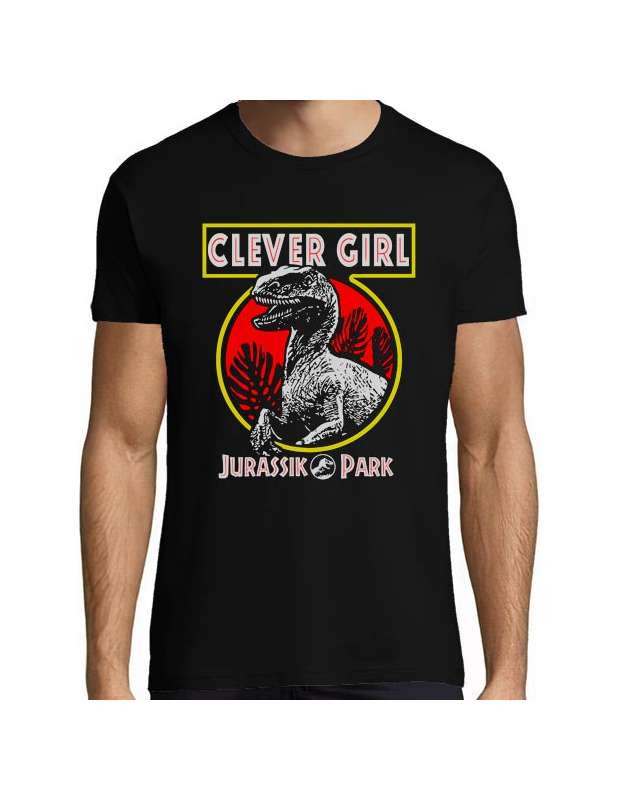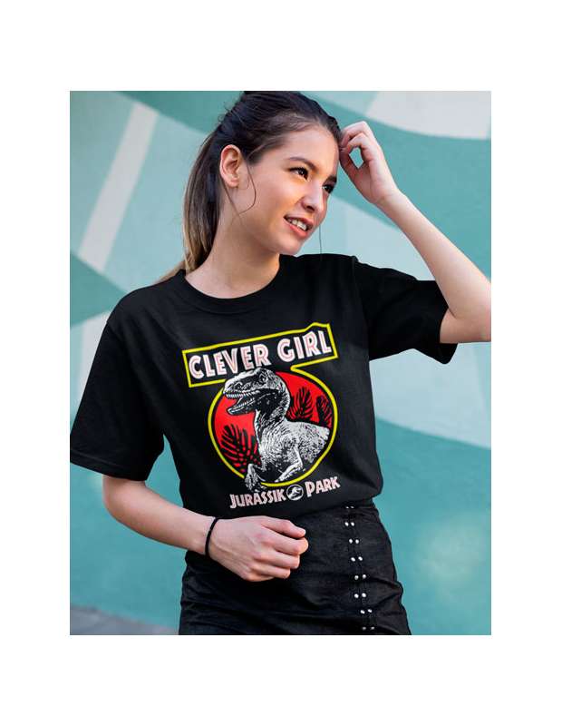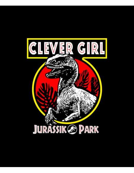 Camiseta de Jurassic Park "Parque jurásico" Clever Girl que se podría traducir como chica lista o que lista eres.Inspirada en la escena en que el velociraptor escapa de su jaula en Jurassic Park y el cuidador de dinosaurios Robert Muldoon intenta darle caza sin exito gracias a la gran inteligencia de la raptor.