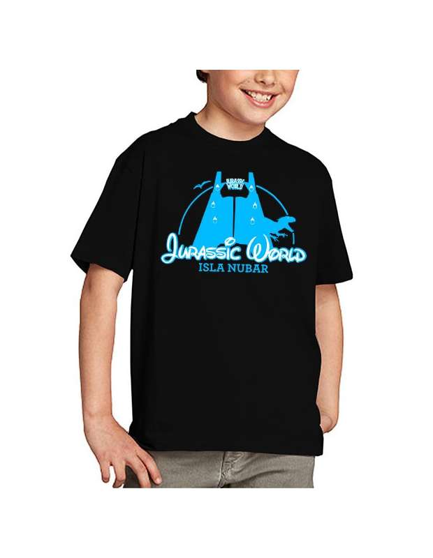 Camiseta personalizada para niños inspirada en la famosa pelicula Jurassic World dirigida por Steven Spielberg, Diseño exclusivo Isla Nubar estilo Disney . Camiseta fabricada en manga corta, algodón 100% y estampada en España. Disponible en varios colores.