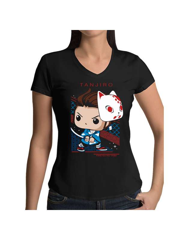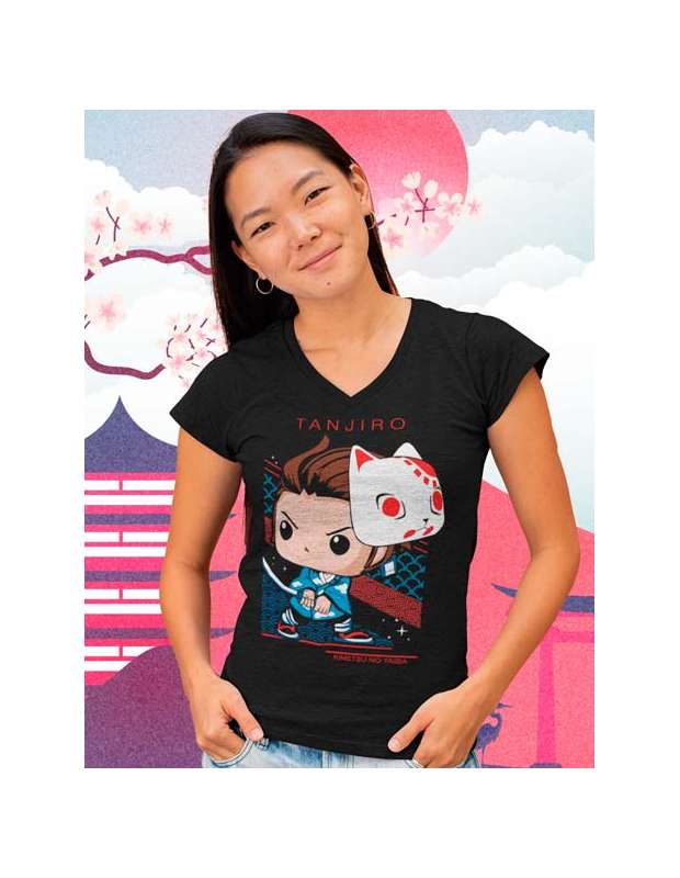 Estupenda camiseta de mujer del Anime Kimetsu no Yaiba o Demon Slayer estampada con un dibujo muy original de Tanjiro Kamado al estilo Funko Pop. La camiseta es de algodón 100% y es de manga corta estilo japonñes y cuello de pico.