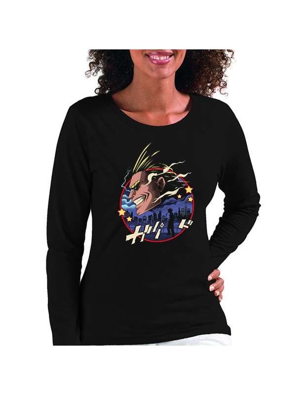 Camiseta de mujer estampada con un dibujo de All Might en forma de emblema inspirada en el Anime y Manga My Hero Academia - Boku No hero Academia. En esta camiseta de My Hero academia aparece la sonrriente cada de All Might mas su sombra eschuchimizada cuando es una persona normal. La camiseta está personalizada con un diseño exclusivo especialmente pensado para las más fans de este fantástico Anime de superhéroesde manga corta o larga a elegir.
