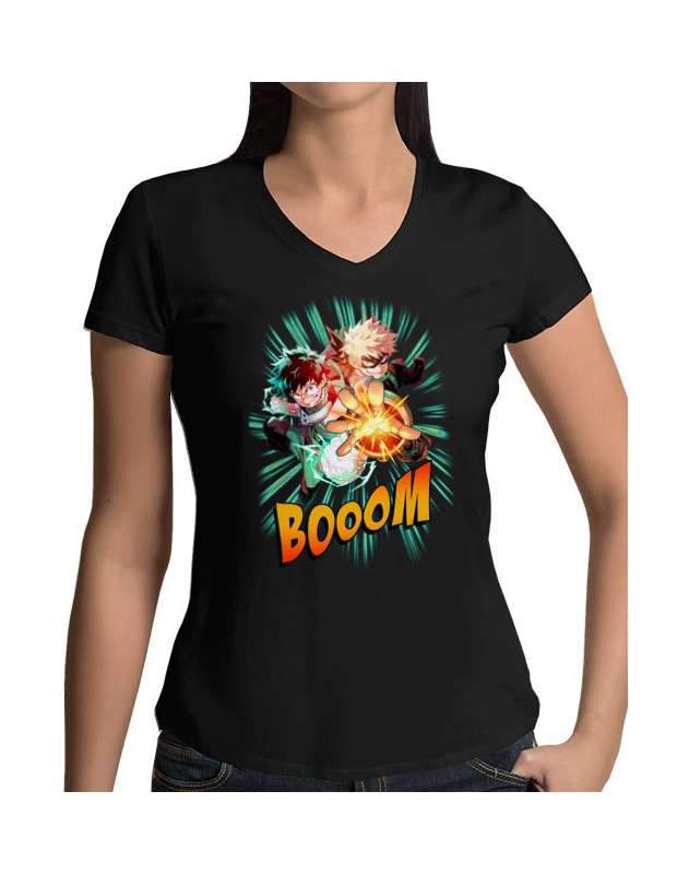 Camiseta de mujer estampada con un estampado exclusivo de Deku y Bakugo Boom inspirada en el Anime y Manga My Hero Academia - Boku No hero Academia. Esta camiseta de Deku y Bakugo de My Hero academia de mujer está personalizada con un diseño exclusivo especialmente pensado para las más fans de este fantástico Anime de superhéroes y está fabricada en 100% algodón.
