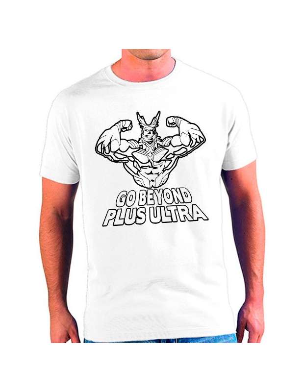Camiseta My Hero Academia estampada con un diseño exclusivo Fan Art de All Might con la frase Go Beyond Plus Ultra. Esta camiseta del Anime Boku no hero academia la tienes disponible en manga corta y en 2 colores a lelegir según tu elección y en tallas de niño y adulto de corte unisex. Está fabricada en algodón 100% de 150gms y estampada en España con tintas respetuosas con el medio ambiente de gran resistencia a los lavados
