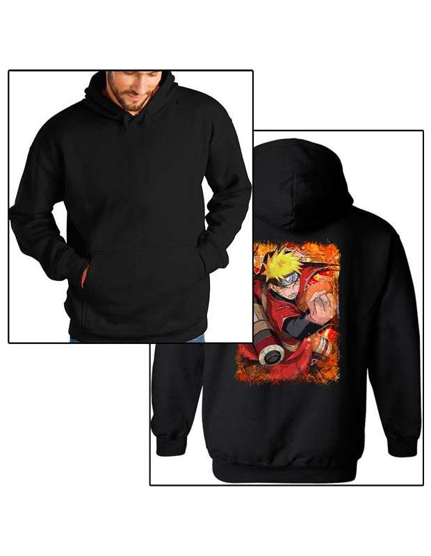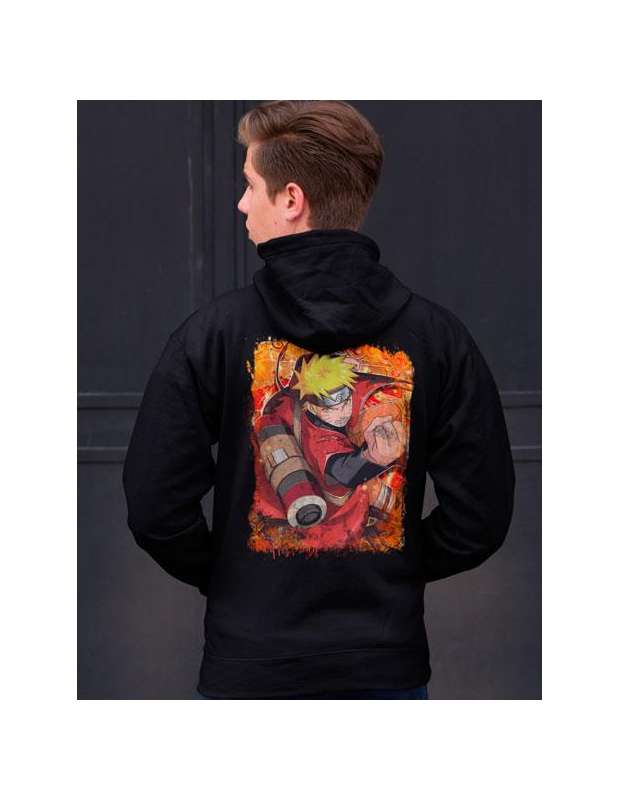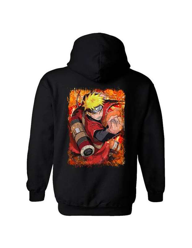 Estupenda sudadera con capucha de Naruto estampada con un dibujo artístico estilo tapíz desgastado estampado en la espalda de la sudadera. El diseño simula un tapíz de Naruto con un pequeño desgaste que le otorga un aspecto vintage a la sudadera y la convierte en una exclusividad de nuestra web. Por la parte de delante la sudadera es lisa con bolsillo para las manos en la cintura