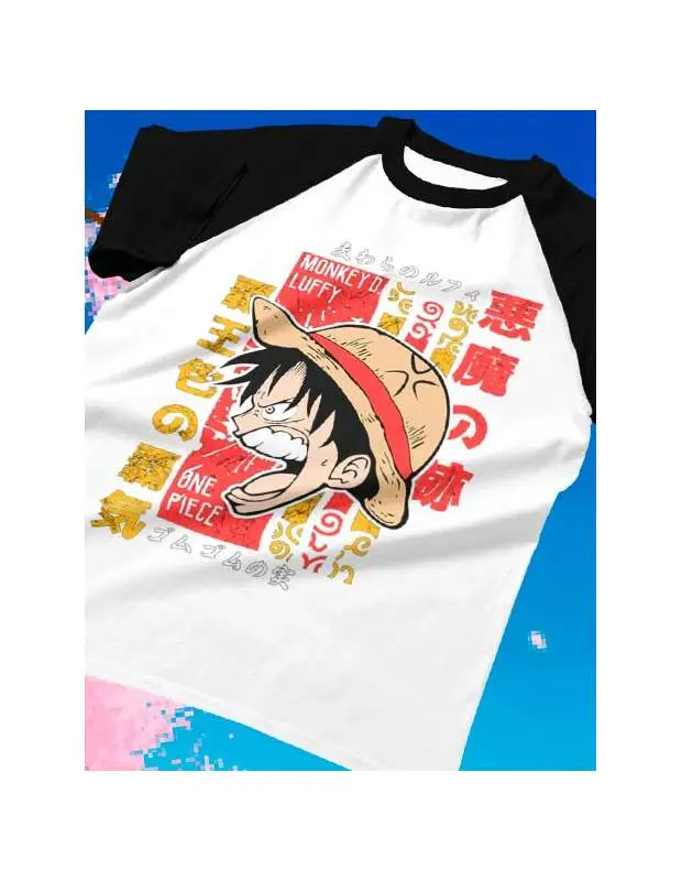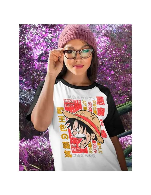 La camiseta tiene estampado en la parte frontal un genial dibujo fanart de Monkey D Luffy, el pirata del sombrero de paja... y en cuanto al estilo es de manga corta raglan bicolor y corte recto Unisex apta para hombre o mujer.