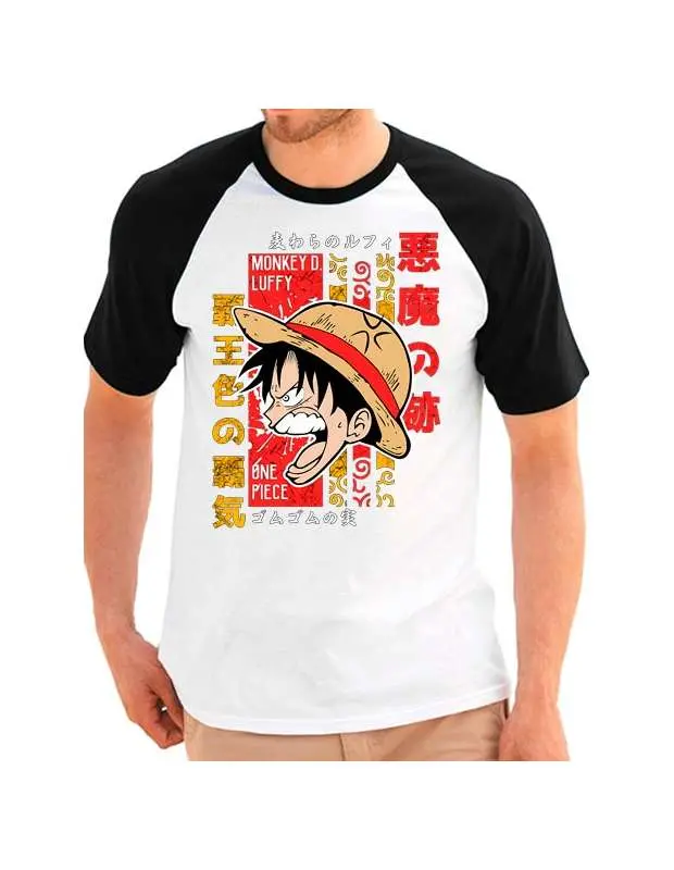 Camiseta One Piece de Monkey D.Luffy enfadado de color blanco y manga reglan negra estilo años 80 de manga corta para ideal para los meses de primavera y verano .