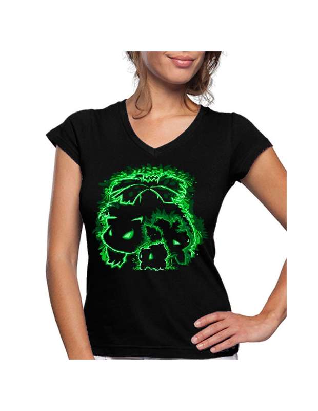 Camiseta de mujer inspirada en el Pokémon Bulbasaur y sus 2 evoluciones Ivysaur y Venusaur . Un diseño muy original en el que se intuyen las siluetas de las 3 fases de este Pokémon de tipo planta. Camiseta para chicas fans de Pokémon y sobre todo de los Pokémon clásicos con un diseño exclusivo y diferente. Camiseta de manga corta estampada en España con tintas respetuosas con el medio ambiente y con tu piel de gran resistencia a los lavados.