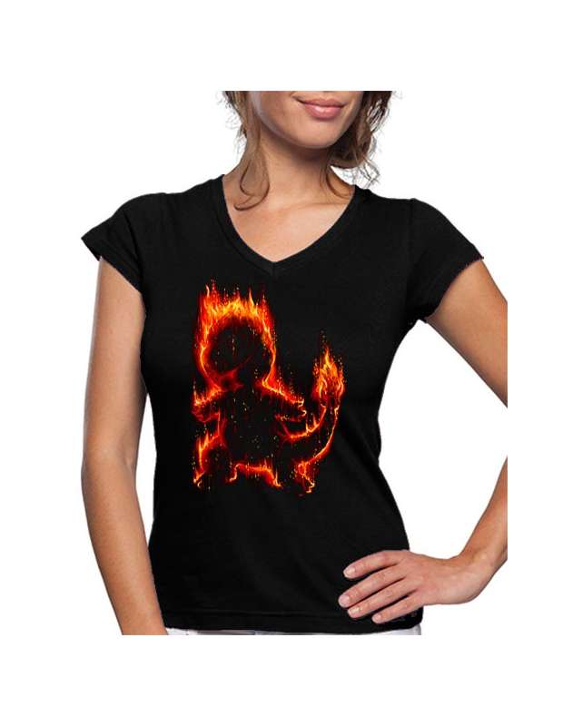 Camiseta de mujer inspirada en el Pokémon Charmander en llamas. Un diseño muy original en el que se intuye la silueta en llamas de este simpatico Pokémon de fuego. Camiseta para chicas fans de Pokémon y sobre todo de los Pokémon clásicos con un diseño exclusivo y diferente. Camiseta 100% de algodón de manga estampada en España con tintas respetuosas con el medio ambiente y con tu piel de gran resistencia a los lavados.