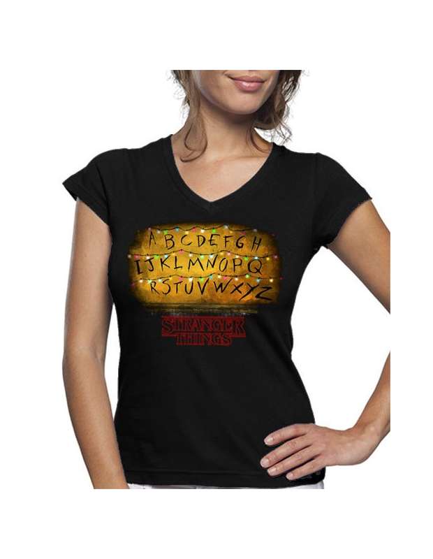 Caracteristicas técnicas de la camiseta de mujer Stranger abededario con luces de navidad.