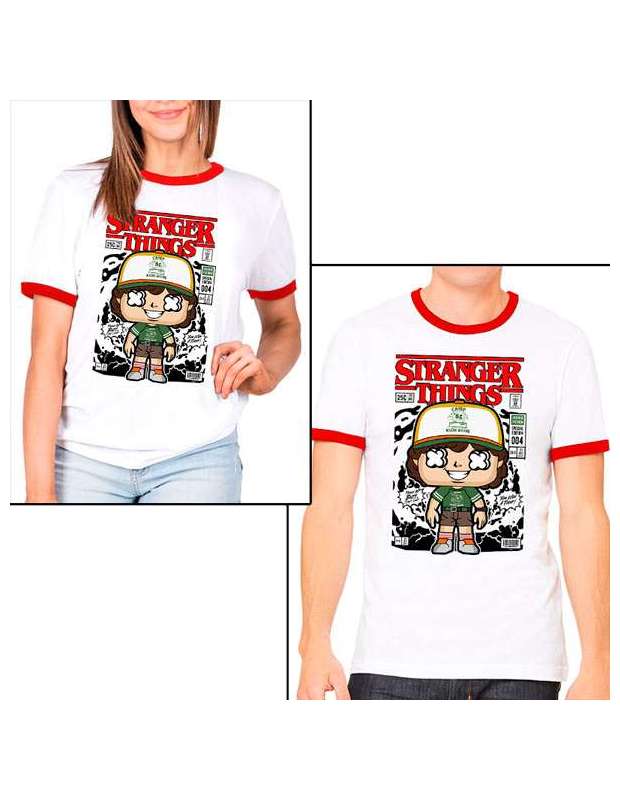 Estupenda camiseta Stranger Things estampada con un fabuloso dibujo artistico de Dustin al estilo Funko que le da un toque de caricatura. En este caso se trata de una camiseta de estilo ringer unisex al estilo de los años 80 de corte unisex para hombre o mujer (Hombre corte ajustado y mujer corte ancho) Por favor consulta las tallas mas abajo de estas líneas.