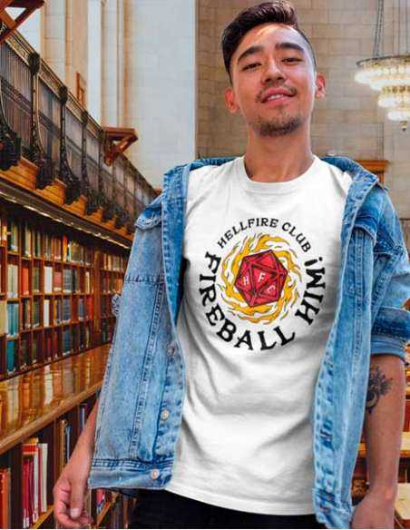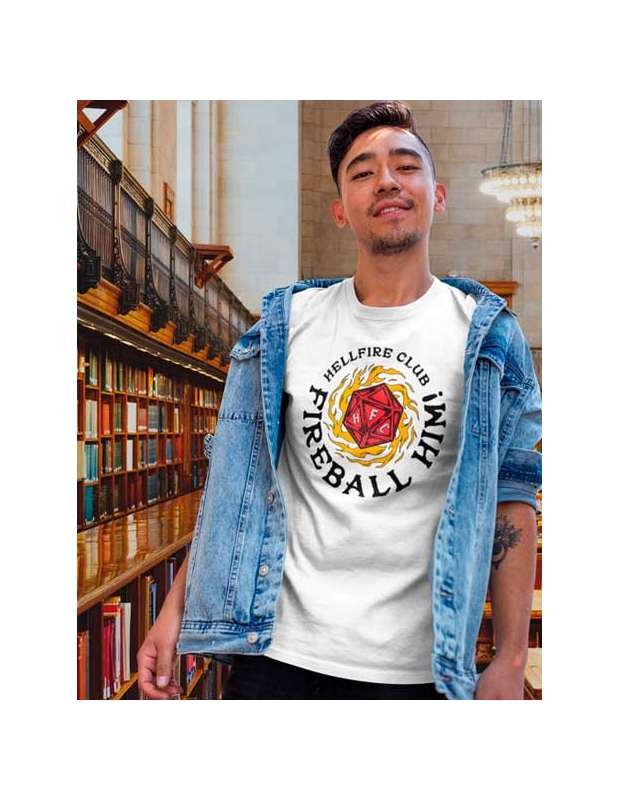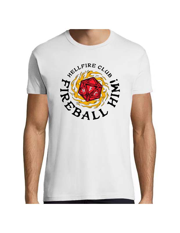 Estupenda camiseta inspirada Stranger Things y en su club de juegos de rol del instituto llamado Hellfire Club, estampada con un diseño muy original Hellfire Club Fireball Him, en el que hay dibujado un dado de rol de 20 caras envuelto en una bola de fuego