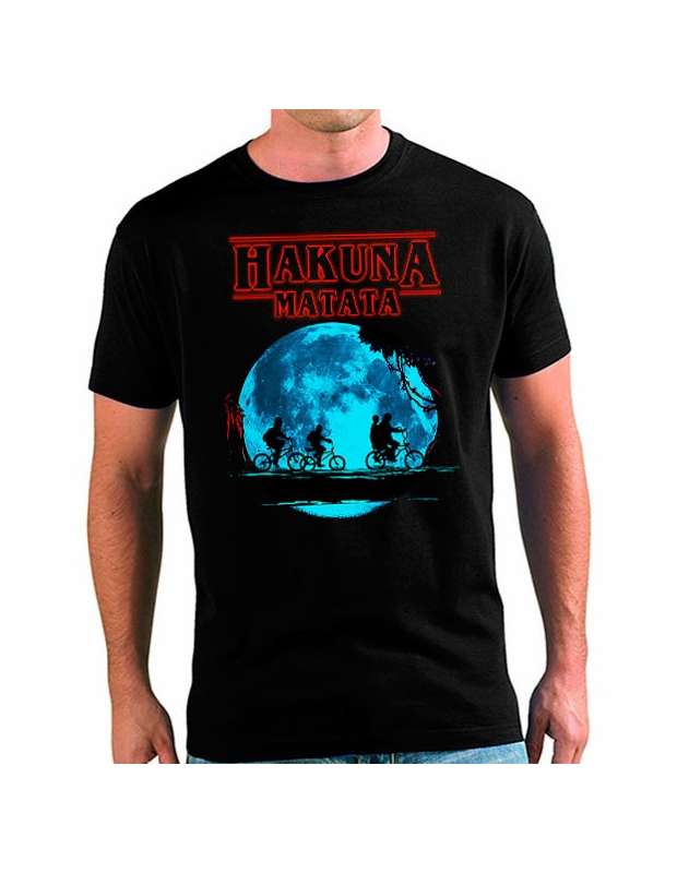 Camiseta Stranger Things personalizada con diseño super original y exclusivo de esta web que recuerda a la escena del Rey León cuando van paseando cantando la cancion de Hakuna Matata y pasan con la luna llena de noche. Camiseta Stranger Things de manga corta fabricada en algodón 100% 150gms. Tallas niño y hombre y estampada en España con tintas respetuosas con el medio ambiente y con tu piel de gran resistencia a los lavados.