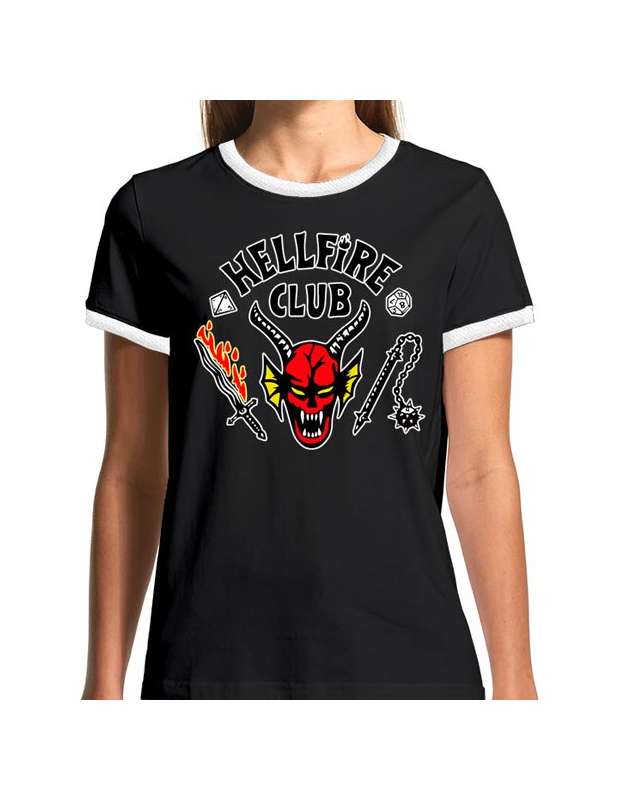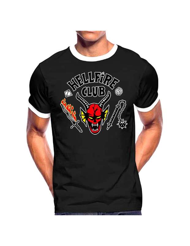 Camiseta Hellfire Club Stranger Things 4 de color negro estilo ringer años 80 con ribetes blancos en cuello y mangas.