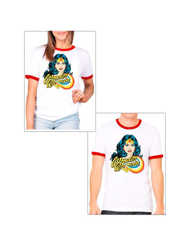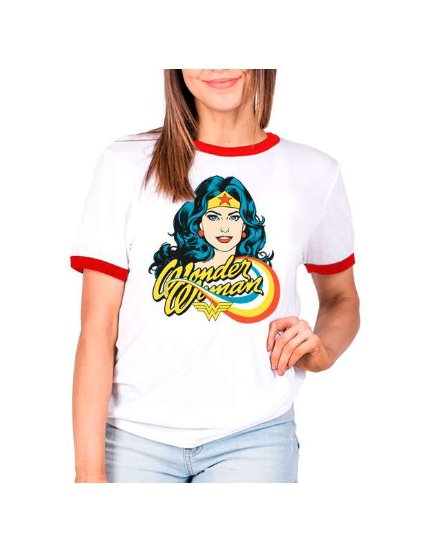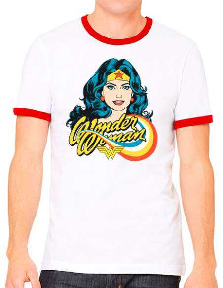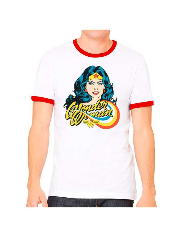 Estupenda camiseta Wonder Woman o Mujer Maravilla unisex ideal para regalar a chicas o chicos fans de esta fabulosa súperherina de Dc. Gracias a su diseño retro inspidrado en los comic antiguos también es una gran idera para el día de la madre o del padre. En cuanto al estilo, es una camiseta ringer de algodon con ribetes rojos en el cuello y mangas como las que se usaban en los años 80.