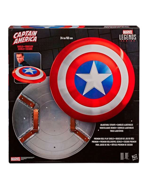 Réplica del escudo del Capitán América clásico de los comic de la colección Marvel Legends de tamaño real . Se trata de una réplica Premium a escala 1:1 (61 cm de diámetro aprox.) del escudo hecho de vibranium del líder de los Vengadores y especialmente realizado por el 80 aniversario de Marvel. El escudo puede embrazarse y sujetarse con correas a medida. Un arma defensiva creada para el defensor de las libertades que ahora puedes usar tú también.
