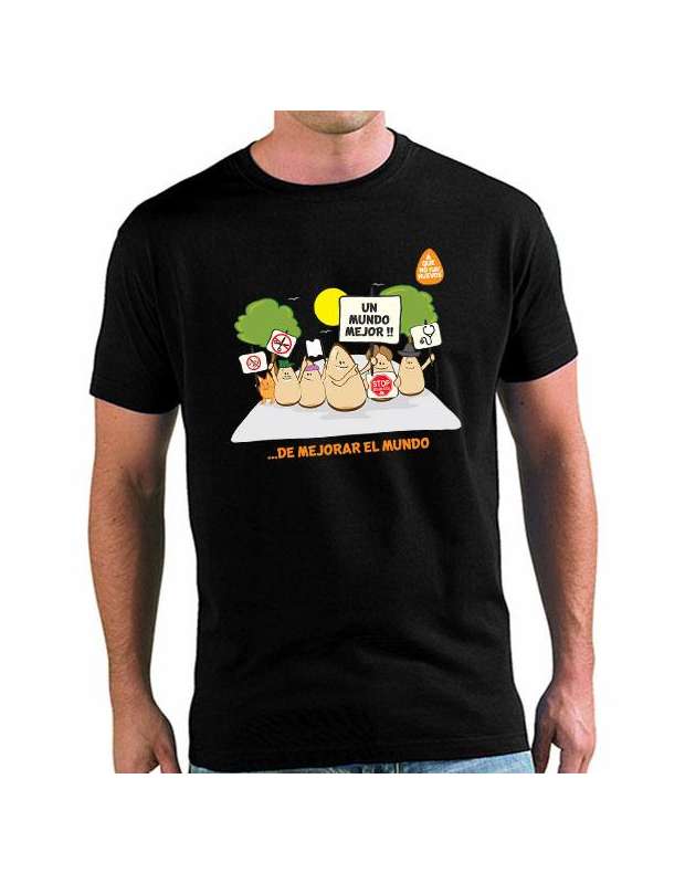Camiseta Mejorar el mundo con diseño de A QUE NO HAY HUEVOS, utilizando la tecnología de alto rendimiento en estampación digital textil que proporciona una reproducción duradera de gran resistencia a los lavados y de calidad.