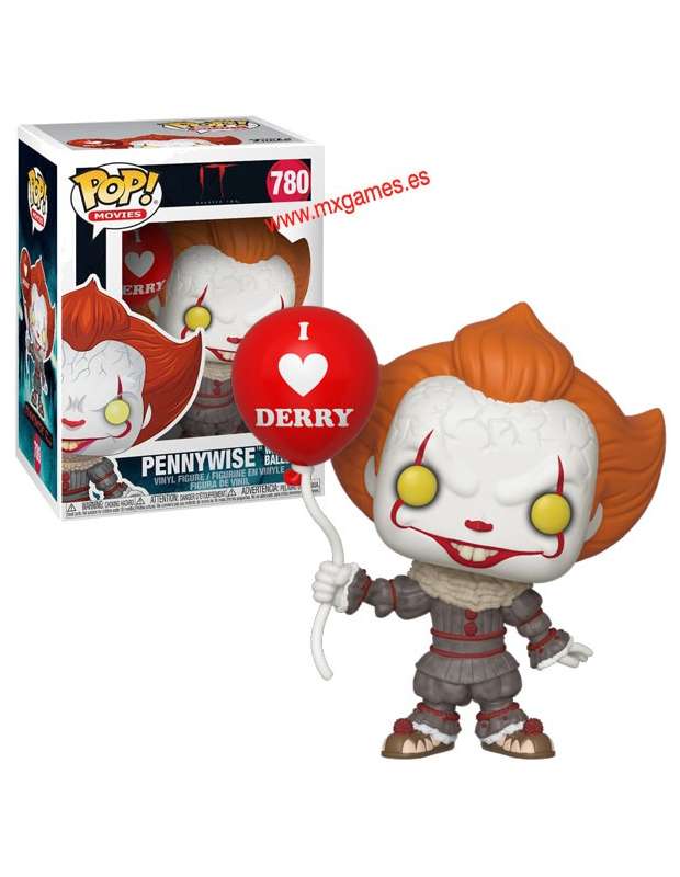Funko Pop de IT El Payaso bailarín Pennywise inspirado en el capítulo 2 de las peliculas IT de Stephen King. En esta figura Funko Pop de IT tenemos a Pennywise sosteniendo un típoco globo Rojo que pone "I Love Derry" todo un clásico en las películas de IT.