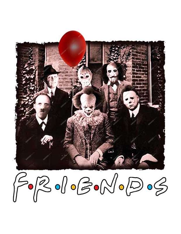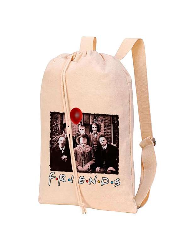 Mochila de algodón fuerte, inspirada en los personajes de peliculas de Terror más famosos. Espectacular diseño estampado sobre mochila de algodón fuerte donde aparece una fotografía foto imitación a antigua con colores tipo sépia de los mejores amigos de It el payaso Pennywise; Freddy krueger, jason voorhees , Saw, hannibal lecter y Michael Myers. Todo ello culminado con el logo de Friends. Desde Luego una mochila que no va a dejar a nadie indiferente y es ideal para regalar en fechas señaladas como Halloween a los más fans del cine de terror.