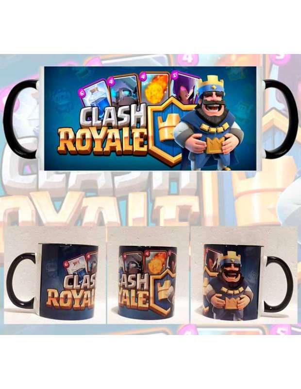 Taza de cerámica con el asa e interior en negro tipo Hornet, decorada con un diseño customizado del videojuego clash Royale donde aparecen el Rey Azul con un mazo de cartas.Ésta taza es un regalo ideal para los fans de Clash Royale que ya es el videojuego más jugado de 2017 en smartphone.