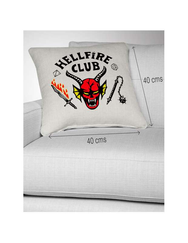 Fantástica funda de cojín personalizada con el popular emblema o dibujo de Hellfire Club de Stranger Things 4 fabricado en algodón naural.