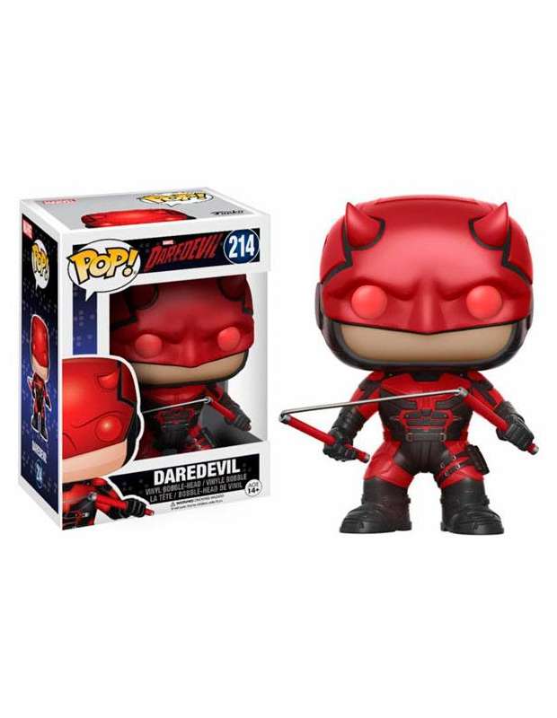 Figura Funko pop Marvel de Daredevil con sus famosos bastones con el traje de la serie de Tv Netflix. Figura Pop Daredevil nº214 Marvel presentada en caja original con ventana y con buen detalle en sus acabados.Tamaño 10cms (tamaño standar de figuras Pop) Fabricada en Vinilo.