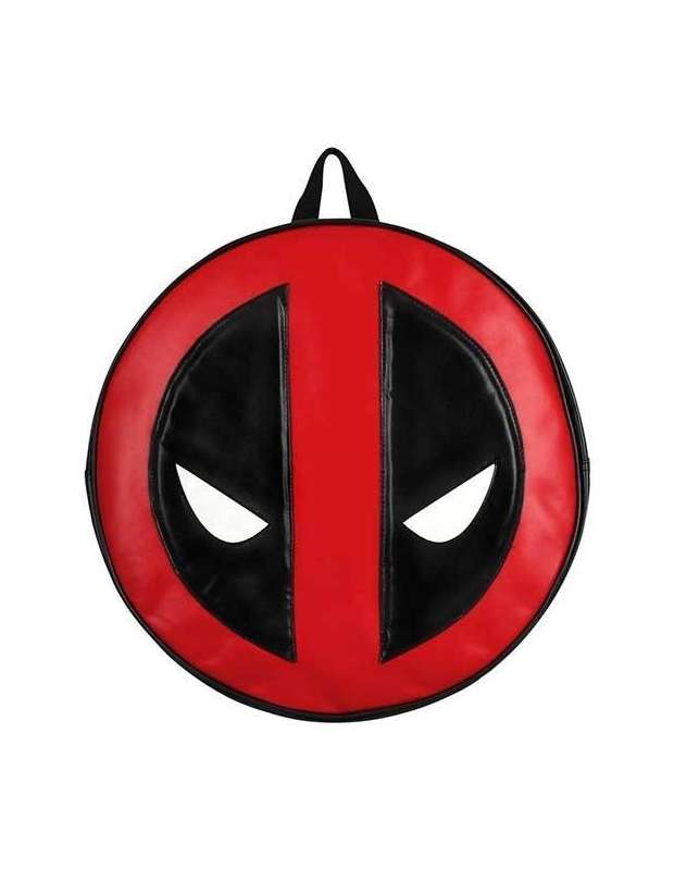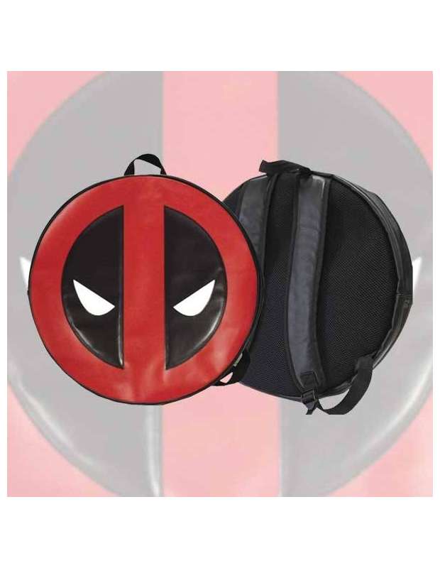 Mochila deadpool fabricada material sintético parecido al cuero pero más ligero con forma redonda simulando la máscara de Deadpool. La mochila Deadpool tiene un bolsillo interior y tiene la parte de la espalda un poco acolchada. Mide unos 45 cms de diámetro y las piezas de la mochila están cosidas con lo que le dá un aspecto mñas robusto.