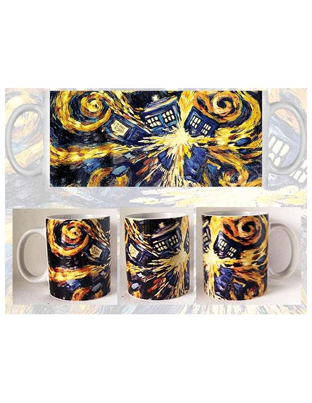 Taza con diseño original de la nave del Doctor Who La Tardis explotando, pintada por Vincent Van Gogh en unos de los episodios más famosos de la serie Doctor Who. Dicha pintura de Vincent Van Gogh previene al Doctor para que tome medidaspara que la explosión de la tardis no destruya el tiepo y el espacio.